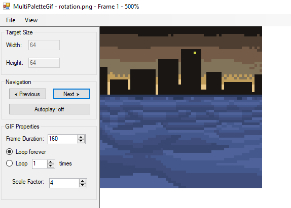 It's really simple, you create a static image (e.g., a PNG file) in an external editor of your choice and it colorizes the result into a multi-palette GIF image file. You can preview and scrub through the frames as you make adjustments. Comes in handy since there are not a lot of modern art tools (that is- Win32 and not DOS, say) that prioritize support for indexed color much less make color cycling easy.