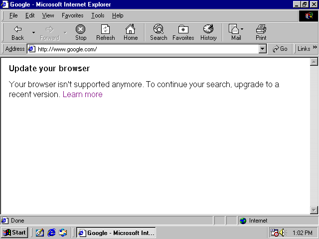 There are a couple obstacles keeping your old Win9x box from browsing the modern Internet. For example, if you try Google: