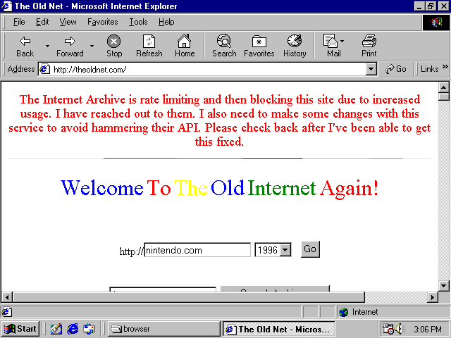 When people say they want to functionally get web browsing on Win98, I think they're misrepresenting things. Because in actuality, they want to travel back in time to use and view the web sites from back then.